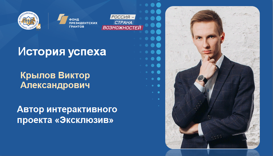 Сегодняшняя история успеха посвящена Виктору Крылову, автору молодёжного интерактивного проекта «Эксклюзив» и инициатору флешмоб-эстафеты «Навстречу пятнадцатилетию», посвящённой 15-летию Всероссийского конкурса «Моя страна - моя Россия».