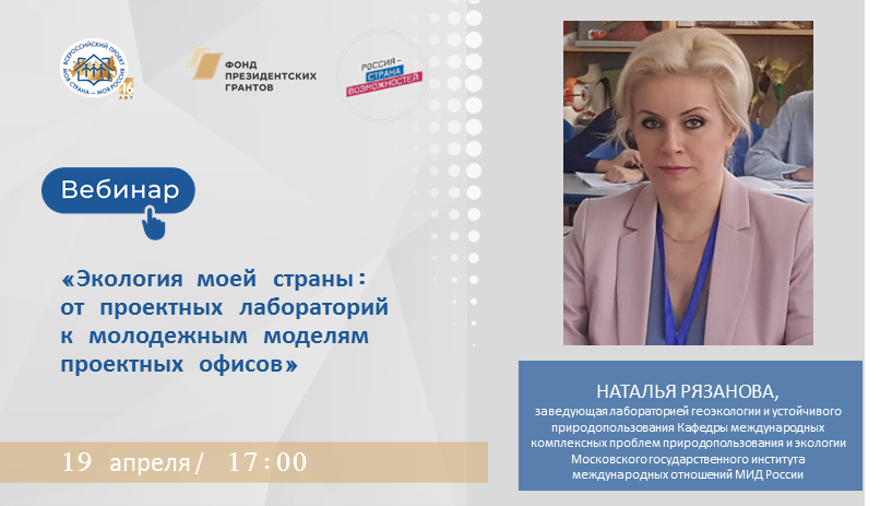 Итак, в пятницу, 19 апреля в 17.00, заведующая лабораторией геоэкологии и устойчивого природопользования Кафедры международных комплексных проблем природопользования и экологии Московского государственного института международных отношений Министерства иностранных дел Российской Федерации, сокоординатор номинации «Экология моей страны» Наталья Евгеньевна Рязанова проведет вебинар «Экология моей страны: от проектных лабораторий к молодежным моделям проектных офисов».