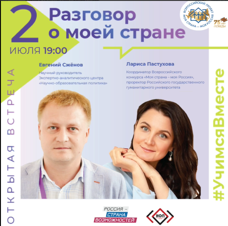 Завтра в прямом эфире Евгений Сжёнов, научный руководитель Экспертно-аналитического центра «Научно-образовательная политика» вместе с Ларисой Пастуховой, координатором Всероссийского конкурса «Моя страна – моя Россия», проректором Российского государственного гуманитарного университета, обсудят, как будет меняться Конкурс, а также «перезагрузку» образовательного вектора проекта.