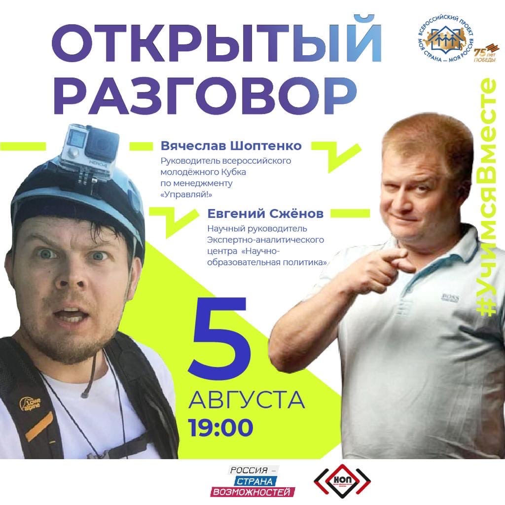 5 августа в 16:00 говорим о взаимодействии проектов платформы «Россия – страна возможностей» с руководителем кубка «Управляй!» Вячеславом Шоптенко и Евгением Сженовым, научным руководителем Экспертно-аналитического центра «Научно-образовательная политика».