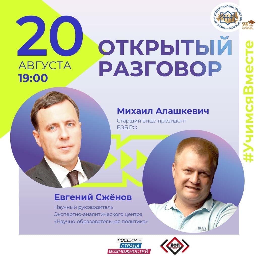 В четверг, 20 августа в 19:00, в рамках #ОткрытойВстречи Евгения Сжёнова, научного руководителя ЭАЦ «Научно-образовательная политика», и Михаила Алашкевича, старшего вице-президента ВЭБ.РФ, обсудим главные тенденции в сфере образования.