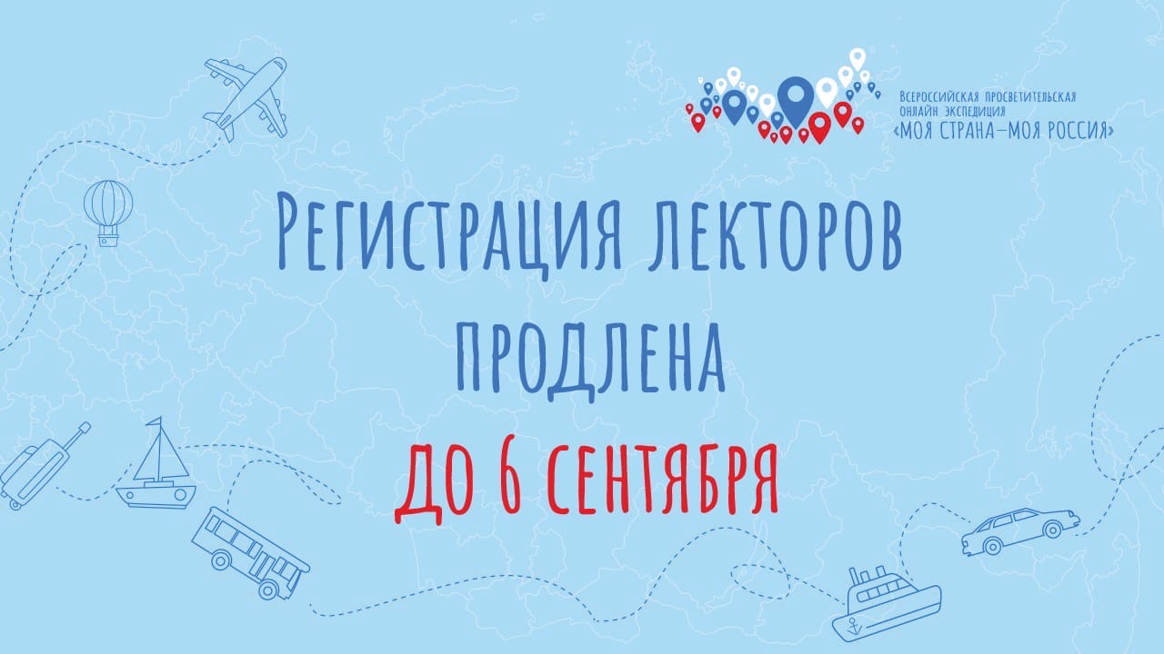 Дорогие друзья! Мы знаем, какой непростой бывает первая неделя учебного года, поэтому решили продлить регистрацию лекторов Всероссийской просветительской онлайн-экспедиции «Моя страна – моя Россия» до 6 сентября (подать заявку можно до 06.09.2020 23:59 по Московскому времени).