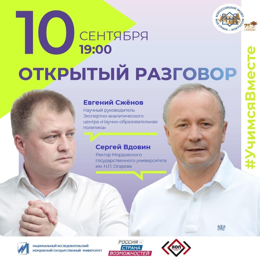 Уже сегодня, 10 сентября, в рамках образовательного онлайн-проекта #УчимсяВместе пройдёт открытый разговор Евгения Сжёнова, научного руководителя ЭАЦ «Научно-образовательная политика» с Сергеем Вдовиным, ректором Мордовского государственного университета им. Н.П.Огарева.