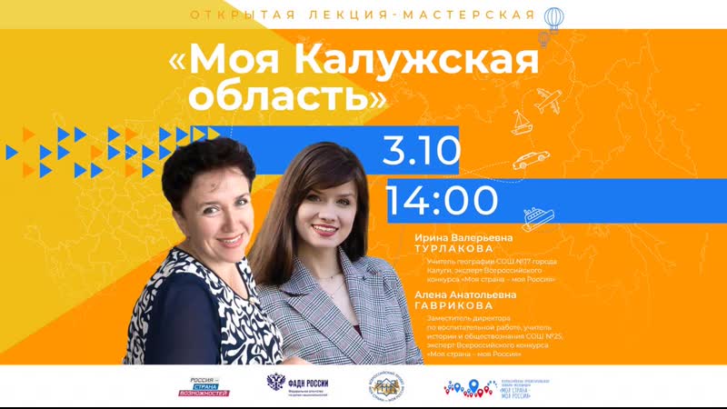 Онлайн-занятие проведут учитель географии СОШ №17 города Калуги, эксперт Всероссийского конкурса «Моя страна – моя Россия» Ирина Валерьевна Турлакова и заместитель директора по воспитательной работе, учитель истории и обществознания СОШ №25, эксперт Всероссийского конкурса «Моя страна – моя Россия» Алена Анатольевна Гаврикова.