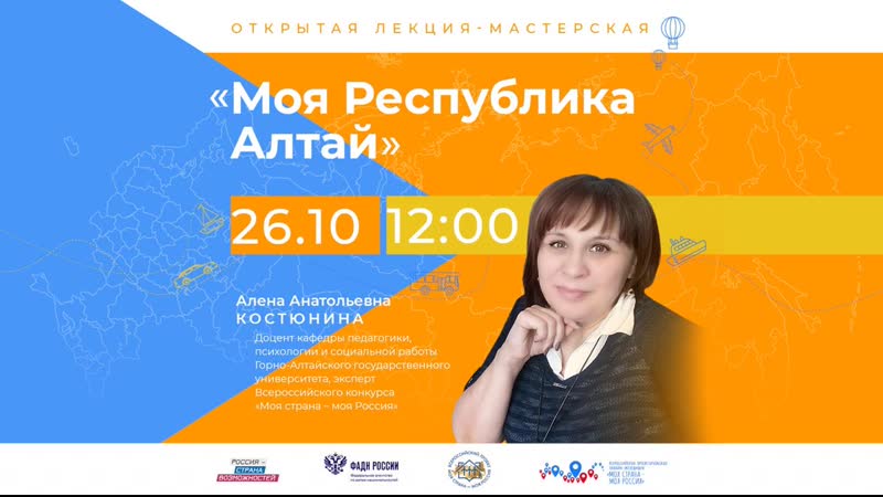 Онлайн-занятие проведёт Доцент кафедры педагогики, психологии и социальной работы Горно-Алтайского государственного университета, эксперт Всероссийского конкурса «Моя страна – моя Россия» Алена Анатольевна Костюнина.