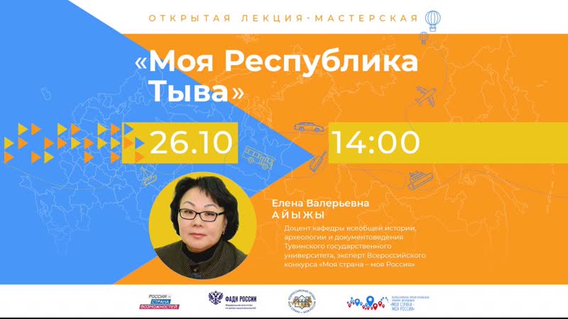 Онлайн-занятие проведёт доцент кафедры всеобщей истории, археологии и документоведения Тувинского государственного университета, эксперт Всероссийского конкурса «Моя страна – моя Россия» Елена Валерьевна Айыжы.