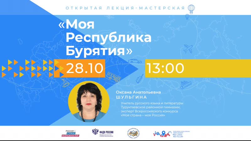 «Республика Бурятия находится в центре Азии, на юге Восточной Сибири. Наша горная местность славится своими природными и архитектурными достопримечательностями, здесь расположено множество заповедников и национальных парков. Снежные горы и солнечные долины, быстрые реки и чистые озера, живописные таежные леса и спящие вулканы, могучее озеро Байкал – самые красивые места нашего края запечатлены на множестве фото и постоянно привлекают огромное число туристов. Рада, что именно мне выпала честь представить нашу республику во всероссийском проекте»