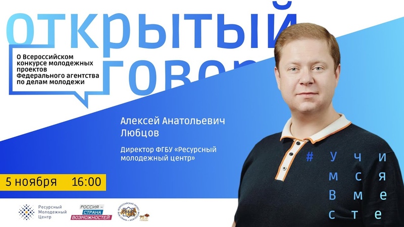 5 ноября в 16:00 в рамках образовательного онлайн-проекта #УчимсяВместе встретимся с директором ФГБУ «Ресурсный молодежный центр» Алексеем Любцовым.