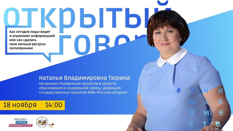 18 ноября в 14:00 узнаем ответы на актуальные вопросы во время #ОткрытогоРазговора с начальником Управления проектов в области образования и социальной сферы Дирекции государственных проектов МИА «Россия сегодня» Натальей Тюриной.