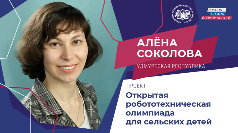 Алёна Соколова, финалистка Всероссийского конкурса "Моя страна - моя Россия", разработала проект Открытой робототехнической олимпиады для сельских детей. Олимпиада проводится с 2018 года и стала ежегодным мероприятием, привлекающим детей Сарапульского района, увлекающихся робототехникой. Ежегодно регламент и положение мероприятия меняется на основе пожеланий участников прошлых сезонов. Сегодня в нем смогут принять участие команды до трех человек в трех направлениях: спортивном, творческом и альтернативном. Первые два подразумевают предварительную подготовку конкурсантов, тогда как третье, альтернативное, направление, предлагает участникам решить задачу, предоставленную на самом конкурсе. Судьями олимпиады выступают сами тренеры участников, что позволяет молодым педагогам получить новый опыт экспертной оценки.