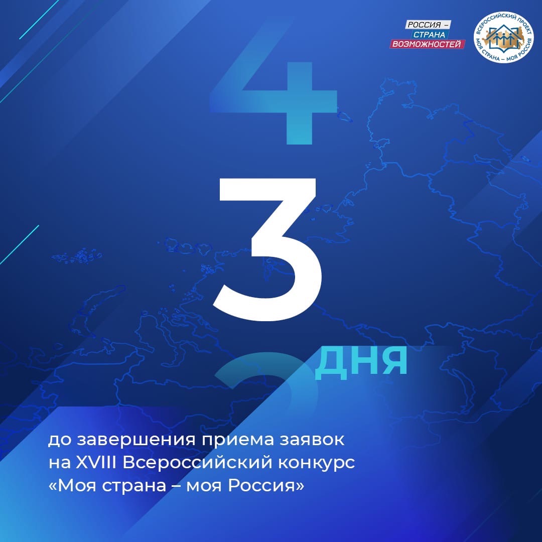 3 дня до конца срока приёма заявок на участие в XVIII Всероссийском конкурсе «Моя страна - моя Россия»