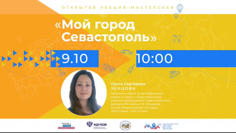 Онлайн-занятие проведёт начальник отдела по воспитательной работе и связям с общественностью, старший преподаватель Севастопольский филиал РЭУ имени Г.В. Плеханова, эксперт Всероссийского конкурса «Моя страна – моя Россия» Ольга Сергеевна Зенцова.