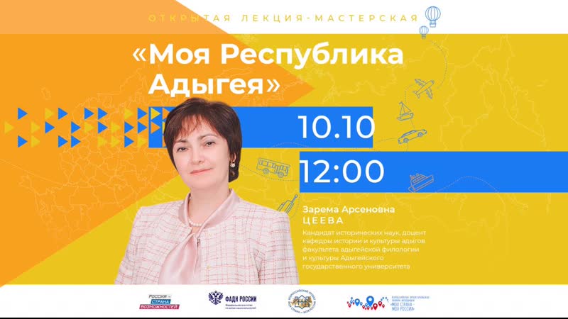 Онлайн-занятие проведёт Кандидат исторических наук, доцент кафедры истории и культуры адыгов факультета адыгейской филологии и культуры Адыгейского государственного университета, председатель регионального отделения Всероссийского общества охраны памятников истории и культуры Зарема Арсеновна Цеева.