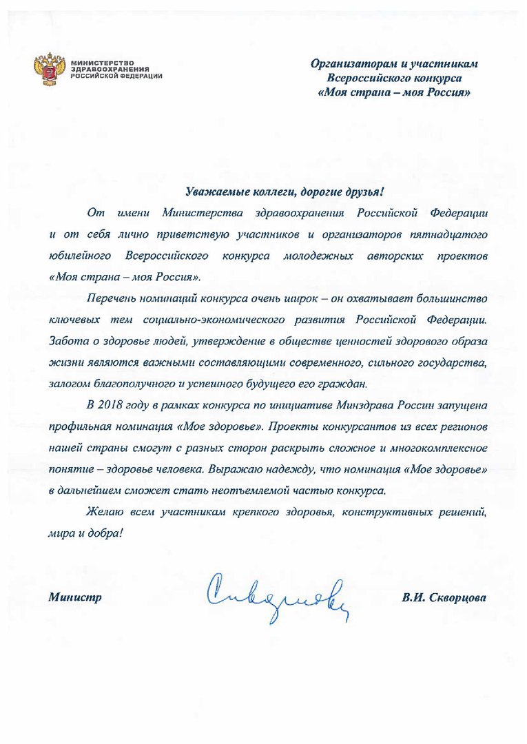 Министр здравоохранения Российской Федерации приветствует участников Всероссийского конкурса "Моя страна - моя Россия"